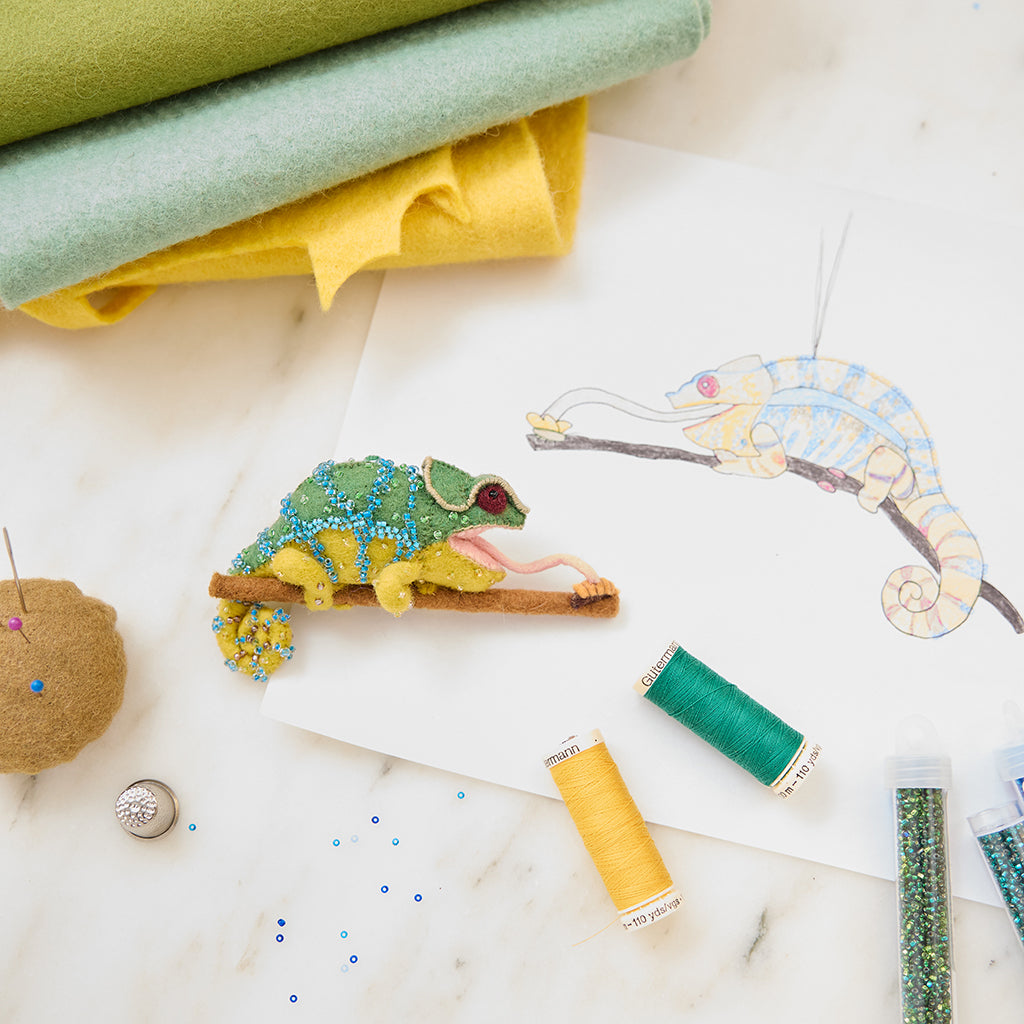 Bring a splash of color and a touch of whimsy to your space with our Chameleon Ornament! This meticulously hand-felted and ornately beaded ornament features a vibrant chameleon perched on a branch, delicately reaching for a grub. Adorned with tropical-colored beads, its scales shimmer with every angle, capturing the essence of nature's palette. The fine stitching details and the chameleon's beaded eyes add depth and character, making it a unique addition to any decor.