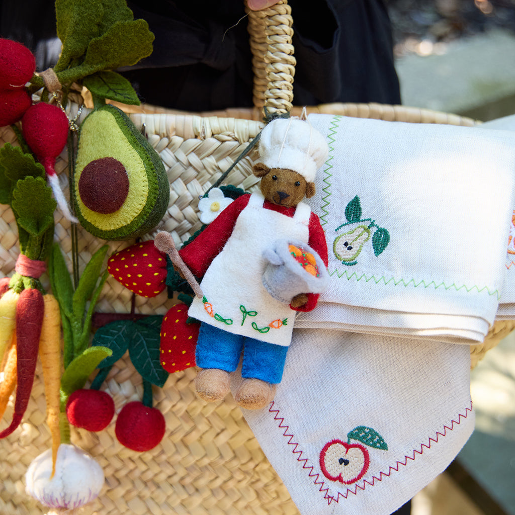 With a pot of tomato carrot soup in one paw and a wooden spoon in the other, our Chef Bear Ornament brings the heart of the kitchen to your holiday celebrations. Dressed in a bright red shirt, soft blue pants, and a hand-embroidered apron, this cozy cook is hand-felted from natural wool by women artisans in Kyrgyzstan.