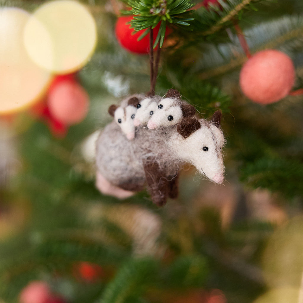 Our Opossum Mom with Babies Ornament is a tender tribute to motherhood and the beauty of the natural world. This sweet marsupial carries her little ones snuggled on her back, lovingly needle-felted with lifelike detail. From her soft pink nose to the curious expressions of her babies, every stitch captures the charm of this woodland family.