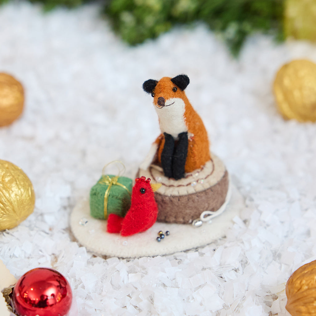 Wander into the snowy woods with our magical woodland Fox ornament. This friendly and graceful fox, perched proudly on a beaded and embroidered woodland stump, captures the quiet magic of winter days and the playful curiosity of forest life. With its little bird friend and presents by its side, it is ready to celebrate the winter festivals.