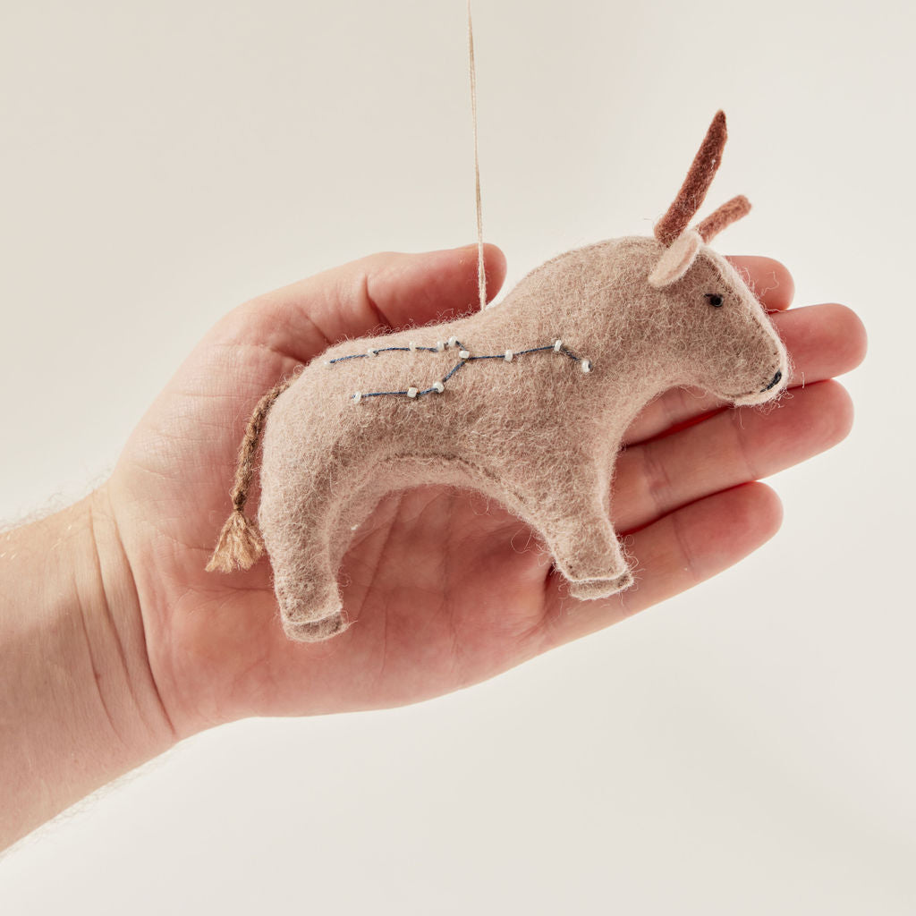 Our celestial bull treads the northern skies. Practical and devoted, our Taurus ornament stands tall and firm. It is bedazzled with an embroidered and beaded constellation and has sequined detail. A perfect ornament for the astrologically minded Taurus.