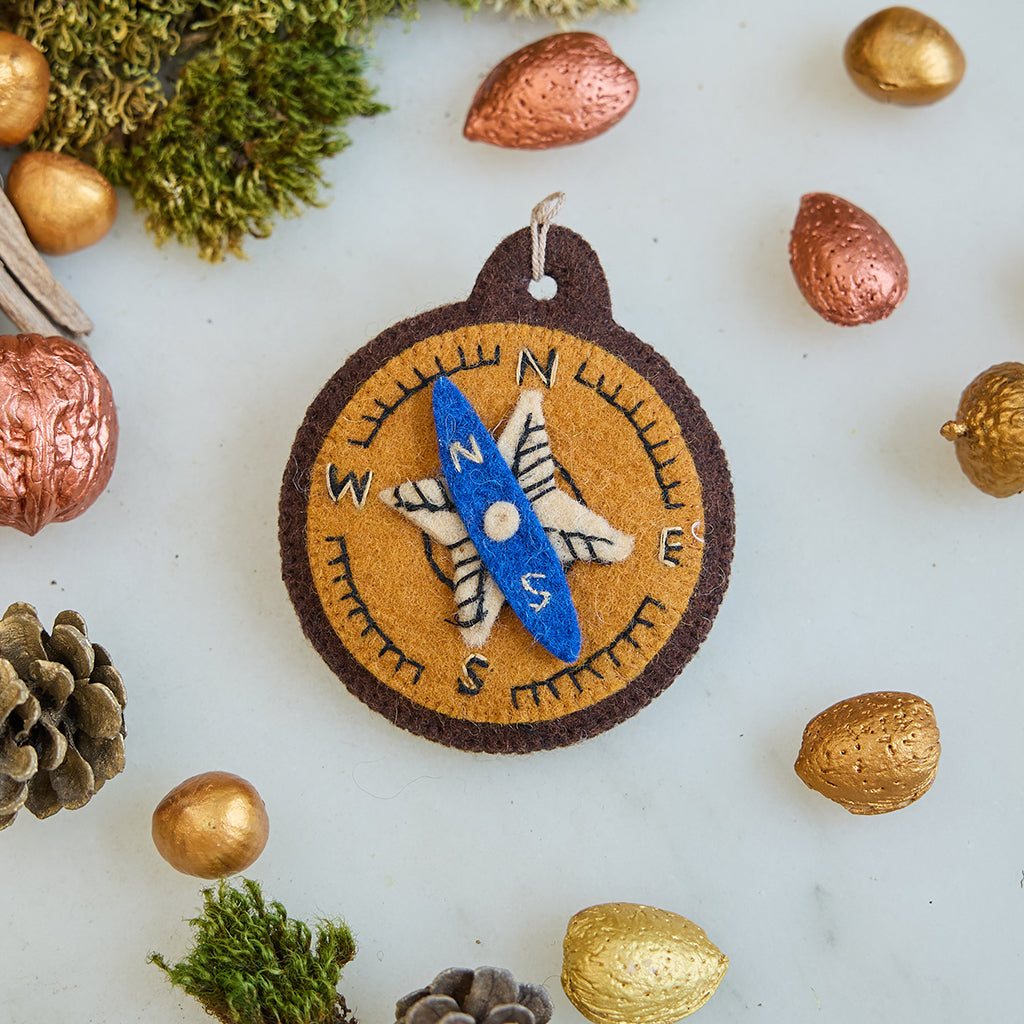 Our Find Your Way Compass Ornament is a heartfelt tribute to the twists, turns, and trail markers that shape life’s journey. Handcrafted from warm, earthy wool felt, this charming compass features a bold blue needle, a stitched starburst dial, and golden directional markers—offering a gentle reminder to always follow your own true north.