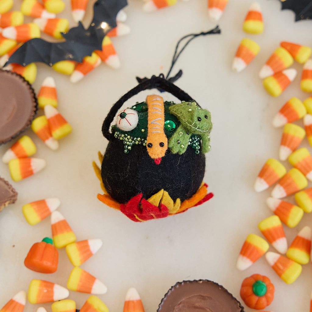 Fire burn and caldron bubble! Stir up some enchanting vibes with this magical cauldron ornament! A fun, sparkly, and spooky piece with touches of newt, frog, and lizard's legs.