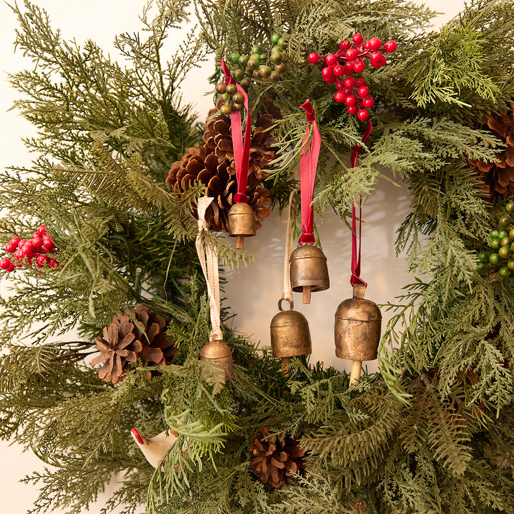 Ring in joy and peace. These very special bells with a magical hand-tuned ring are one of our favorite products we've ever made. The making process, done by our artisan partner in Gujarat, India, includes hand-molding sheets of metal into the bell shapes, which are then covered with clay and fired. Once the bells come out of the fire, they knock off the clay, which has given the bell its special marbled finish. The bells are then tuned by hand, using a mallet, until it has the perfect ring to them. They are tied with red and natural colored ribbons.