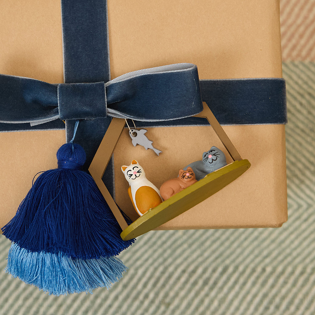 Meow-y Christmas! Our hand-painted trinity of cats sitting on cozy newspaper and gathered around a dangling fish "star" will be the purrfect addition to your nativity collection. A playful feline twist to your classic holiday decor. Cat lovers will swoon! 😻