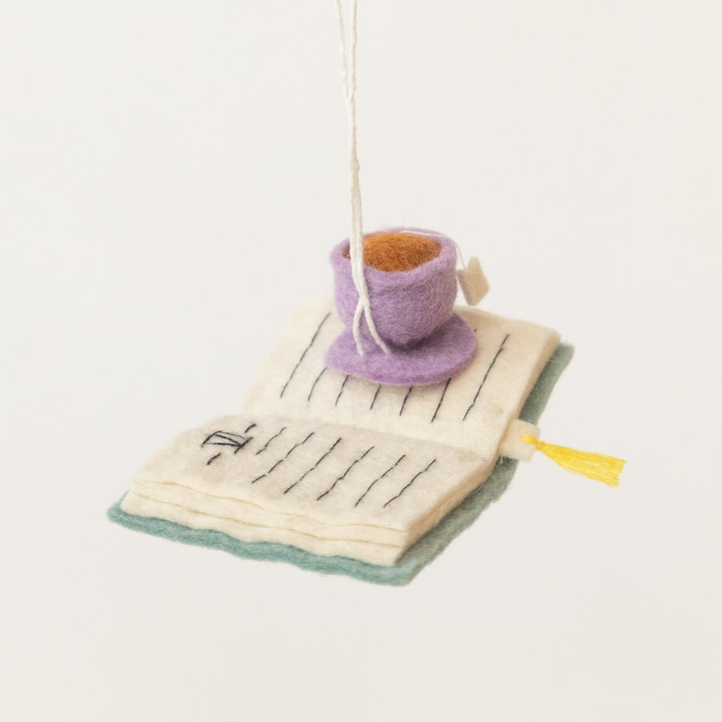 Our Book Lover’s Brew Ornament is a heartwarming celebration of quiet reading moments. Hand-felted with care, this ornament features an open book with stitched pages, a lavender teacup resting on top, and a tiny yellow tassel bookmark peeking from the spine. It’s the perfect blend of literary charm and tea-time comfort.