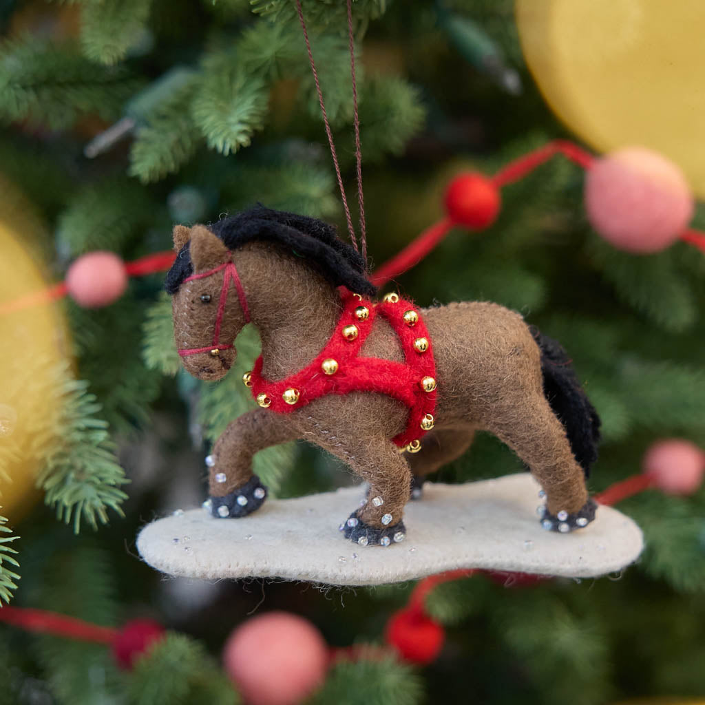Bring a dash of festive magic to your holiday decor with our Winter Horse Ornament, a handcrafted felt beauty adorned with shimmering beadwork that evokes classic sleigh bells. With its bright red reins, plush black mane, and glistening snow-covered base, this horse is ready to trot into your Christmas traditions.