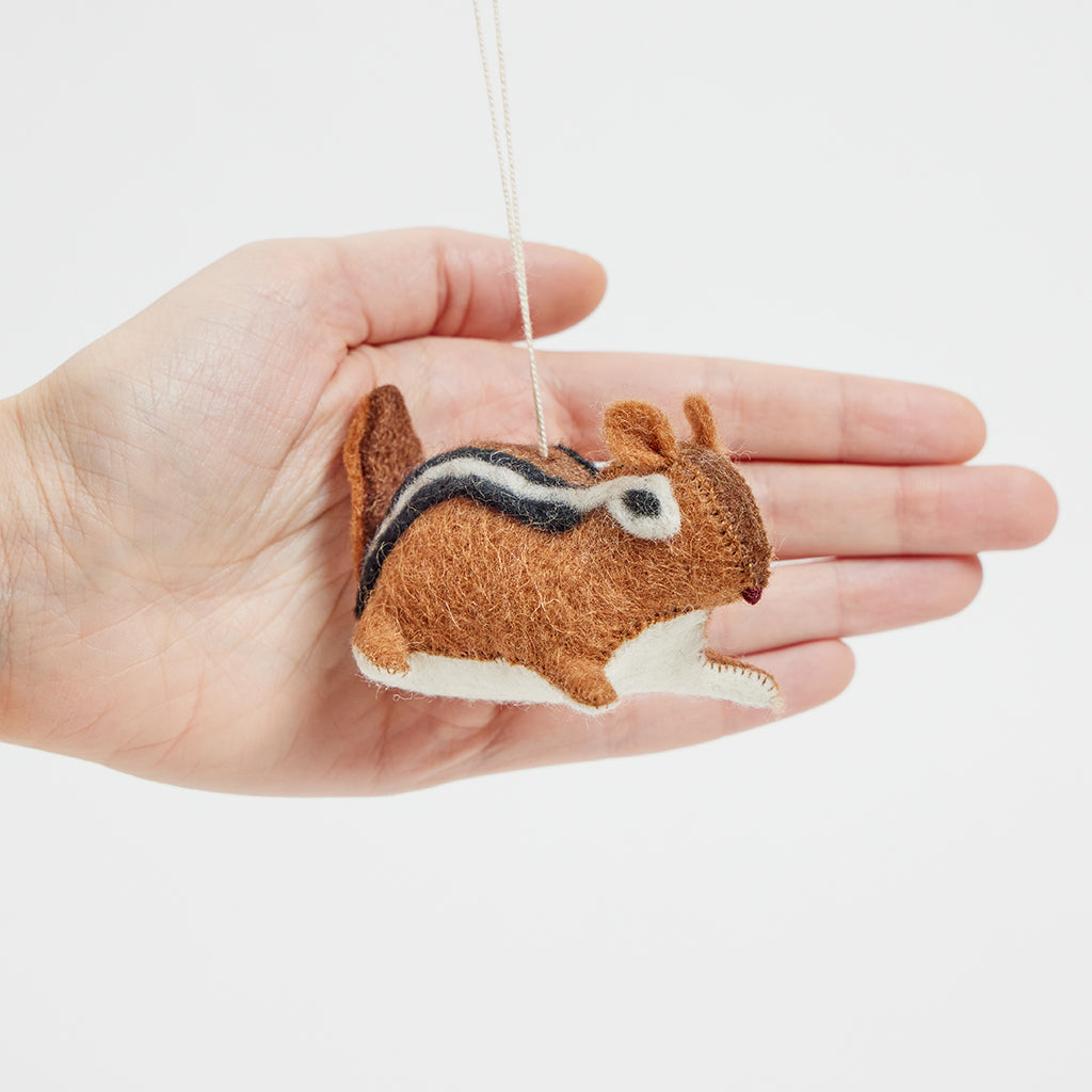 Our little Chipmunk Ornament scurries out from the mossy thicket to add a dash of woodland charm to your home. Beautifully hand-felted from natural wool, this sweet forest friend features soft stripes, a gentle expression, and delicate detailing that brings its curious character to life.