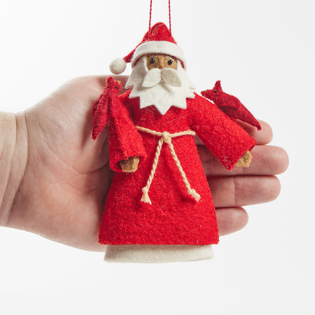 This felt Snowy Garden Father Christmas loves to walk amongst the winter forest. With gentleness, he has befriended many of the forest animals on his walks! This ornament makes a wonderful gift for the nature lovers in your life. He looks beautiful standing on a shelf, mantle, or hanging from a tree.